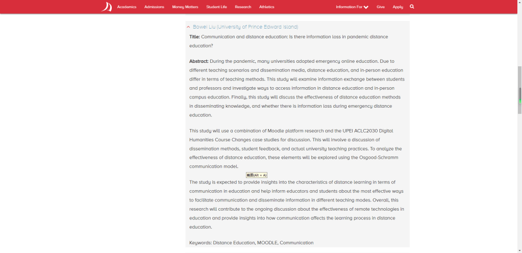 During the pandemic, many universities adopted emergency online education. Due to different teaching scenarios and dissemination media, distance education, and in-person education differ in terms of teaching methods. This study will examine information exchange between students and professors and investigate ways to access information in distance education and in-person campus education. Finally, this study will discuss the effectiveness of distance education methods in disseminating knowledge, and whether there is information loss during emergency distance education. This study will use a combination of Moodle platform research and the UPEI ACLC2030 Digital Humanities Course Changes case studies for discussion. This will involve a discussion of dissemination methods, student feedback, and actual university teaching practices. To analyze the effectiveness of distance education, these elements will be explored using the Osgood-Schramm communication model. The study is expected to provide insights into the characteristics of distance learning in terms of communication in education and help inform educators and students about the most effective ways to facilitate communication and disseminate information in different teaching modes. Overall, this research will contribute to the ongoing discussion about the effectiveness of remote technologies in education and provide insights into how communication affects the learning process in distance education.